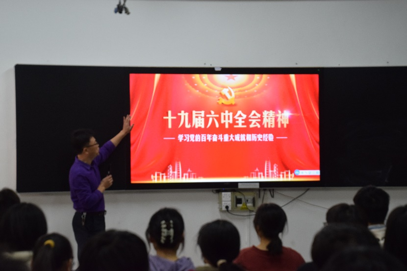 课前,陈院长强调了学习党的十九届六中全会精神的意义之重,他表示站在新的历史起点上,回望过往的奋斗路,眺望前方的奋进路,我们才能壮志在胸、激情满怀。课上,陈院长以宏阔的视角,分别从“第十九届六中全会背景介绍”、“党的百年奋斗的重大成就”、“党的百年奋斗的历史经验”和“实现第二个百年奋斗目标”四个部分总结了党的百年奋斗重大成就和历史经验。他指出党的百年奋斗历程,带领中国人民彻底摆脱了被奴役、被压迫、被欺负的命运,成功开辟了实现中华民族伟大复兴的正确道路,创造了经济快速发展和社会长期稳定的新局面,牢记和践行为中华民族谋复兴,为中国人民谋幸福的初心使命。一百年来,中国共产党在历史进程中积累了许多成功的经验,陈院长以四个坚持阐述了中国共产党取得伟大胜利的必然性,极大地增强了入党积极分子们的志气、骨气、底气,并寄语学生要增强“四个意识”、坚定“四个自信”、做到“两个维护”,大力弘扬伟大建党精神,勿忘昨天的苦难辉煌、无愧今天的使命担当,不负明天的伟大梦想。