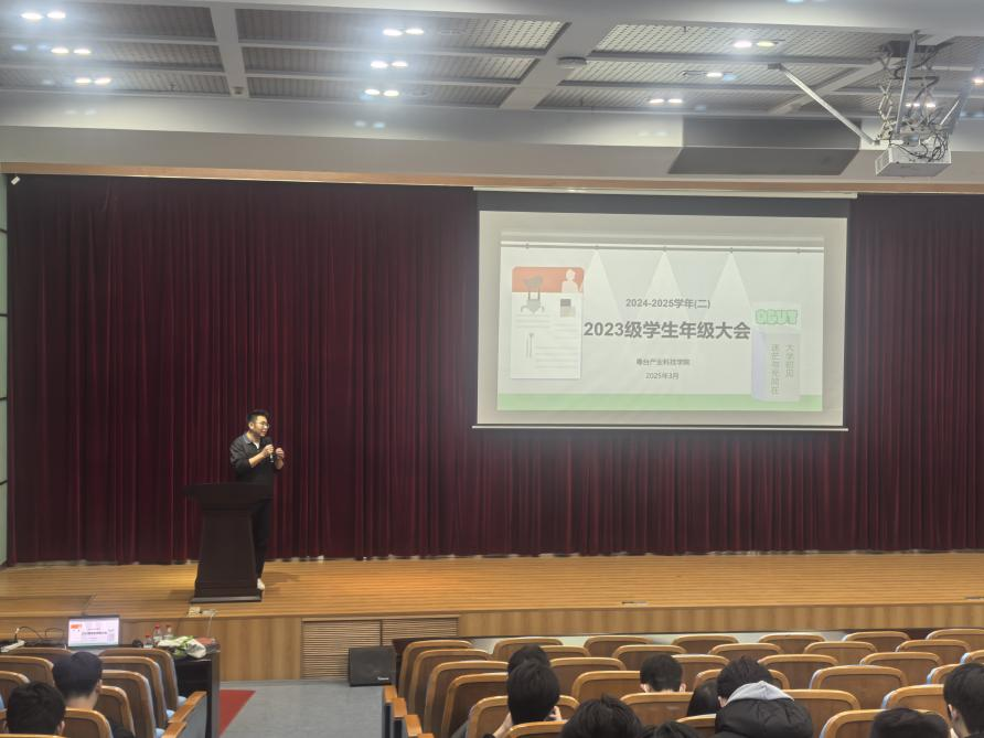 2023级学生春季学期年级大会在莞城校区学术报告厅顺利举行。本次大会由学院辅导员付中鑫主持,2023级全体学生参加会议。会议以“蓄势启航,筑梦未来”为主题,从多个方向为学生们提供一份详实的成长指南。