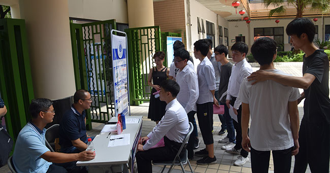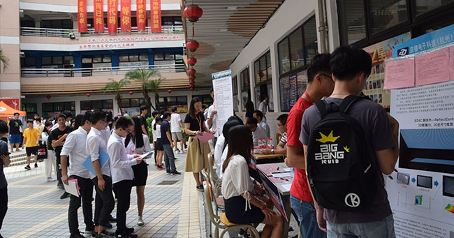 学生实习招聘会在莞城校区实验楼中庭举行,此次招聘会共有35家企业参加,提供了600多个实习岗位,覆盖技术、营销、行政等类型,满足工业设计、金融、多媒体、电商、机械及自动化等专业的需求。