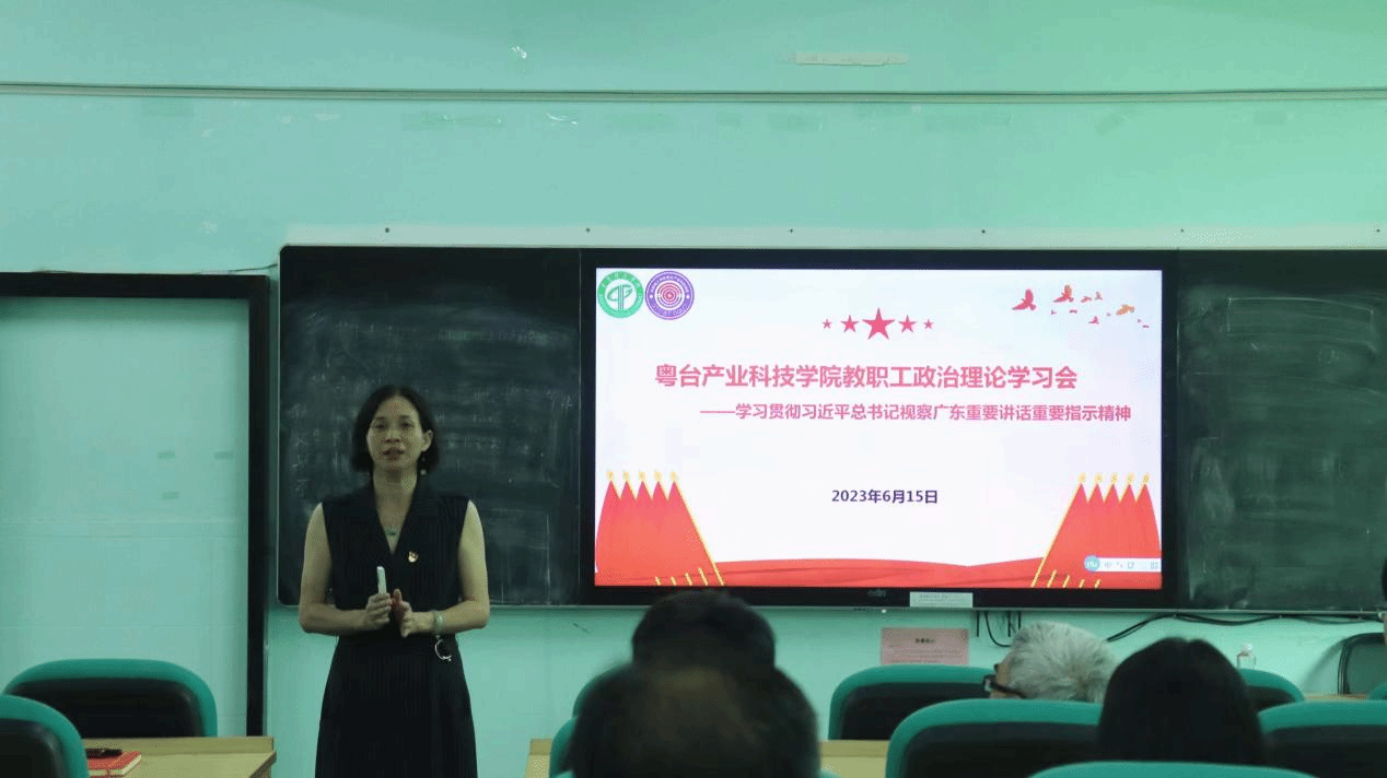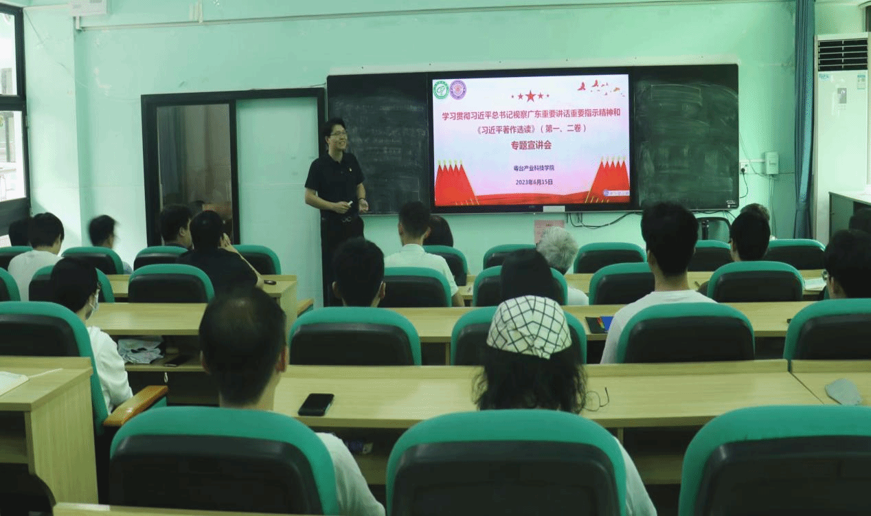 为推动学习贯彻习近平新时代中国特色社会主义思想主题教育走深走实,6月15日,粤台学院党委在莞城校区实验楼305多功能教室开展“学习贯彻习近平总书记视察广东重要讲话重要指示精神《习近平著作选读》第一卷、第二卷”专题宣讲会。学院全体教职工、师生党员、学生代表等参加了专题学习,宣讲会由学院党委书记宋美娴主持,马克思主义学院马冀群博士主讲。