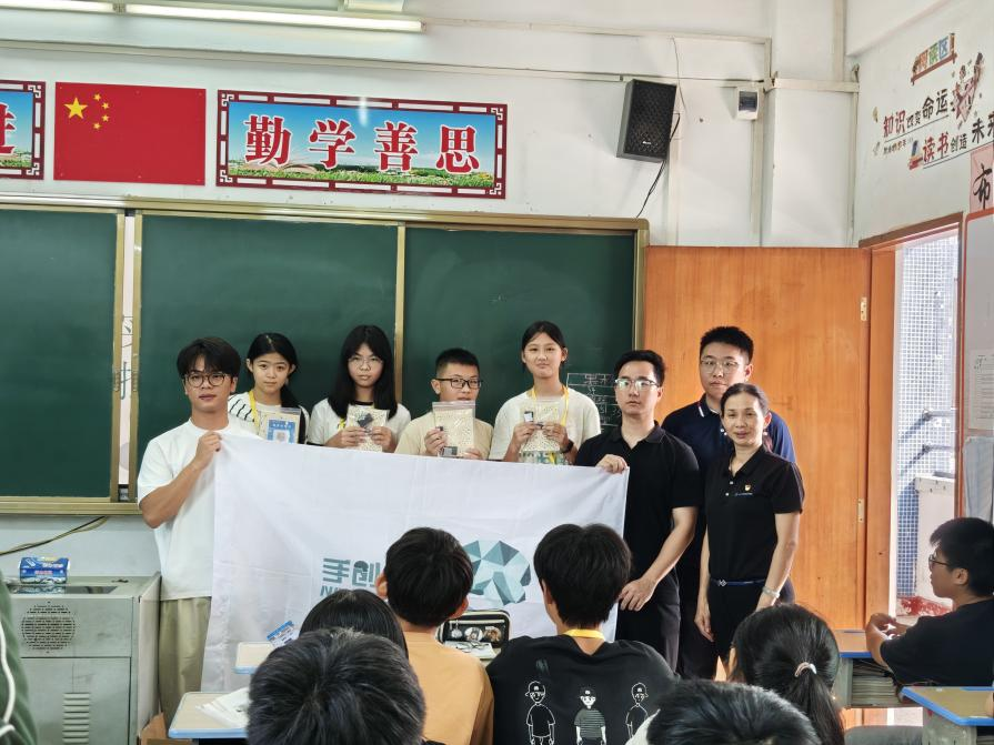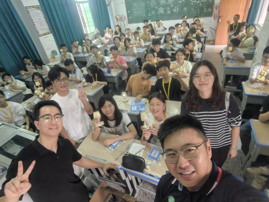 随后,宋美娴书记带领教师党员付中鑫、张星星与校友一起到垾塘下寨中学进行科创教育并送教具活动,实现跨越城‬市界限,传递‬科学火‬种,科普和科技走进校园。课堂上为同学‬们带来《声实音‬验室——声电控‬路原理》科普课‬堂,并指导学生亲‬手制作声‬控小台灯,这不仅是小‬制作,更是“百千‬万工程”送进乡村科‬学的大礼包!用科技点‬亮乡村‬课堂,用实践‬点燃科‬学梦想!