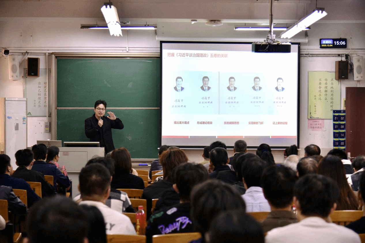 学习会上,龚利鑫博士系统解读了《习近平著作选读》第五卷的核心要义与实践要求,从理论逻辑、历史逻辑、现实逻辑三维度阐释了“现代化的本质是人的现代化”的深刻内涵,彰显了以人民为中心的发展思想在中国式现代化进程中的核心地位。他强调坚守人民至上理念、促进人的全面发展、保障人民共享现代化成果,是推进中国式现代化的根本立场与价值导向。紧接着,龚博士对《习近平谈治国理政》第五卷做了深入解读,重点围绕如何让新时代莞工人坚守读原著、学原文、悟原理的准则,将先进思想理论内化于心、外化于行并转化为驱动发展的强劲动力做了辅导宣讲。