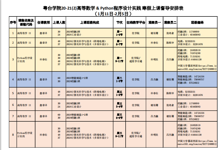 制定了两门课程的寒假上课督导安排表,由各位系主任亲自上线督导并汇报各系上课情况。