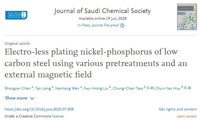 近日,学院2016级机械设计制造及其自动化专业学生梁涛、温楠杭同学在陈尚彦副教授的指导下的研究成果《Electro-less plating nickel-phosphorus of low carbon steel using various pretreatments and an external magnetic field》成功投稿刊发在国际重点学术期刊《Journal of Saudi Chemical Society》,并收录于SCI中。该论文在台湾地区合作高校龙华科技大学的许春耀教授及曹中丞等教授的深度合作下完成,东莞理工学院为第一署名单位。
