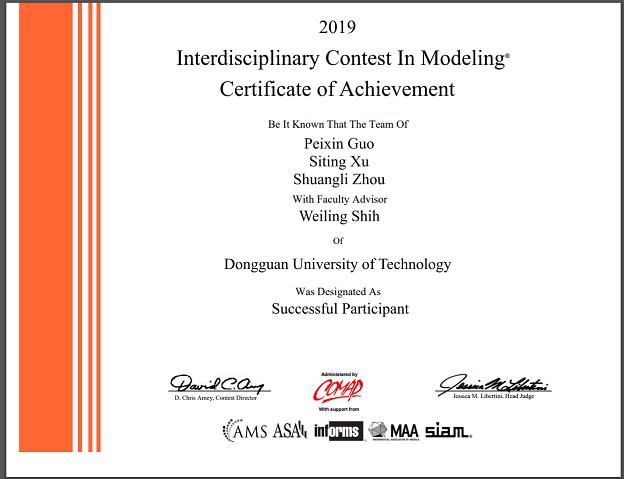 2017级学生郭培信、许思婷及周双利组成的代表队获得了2019年美国大学生数学建模竞赛(MCM/ICM)SP奖(国际三等奖),是学院第二次获得该赛事奖项。据悉,MCM/ICM是COMAP在美国国家科学基金会等联合支持下组织的,是在世界范围内最权威的、最具影响力的国际性大学生数学建模竞赛。