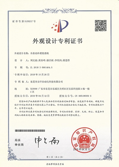 近日,happy漫画 与东莞市吉洋自动化科技有限公司共同设计研制成功的吉洋光学检测设备产品,成功申请了三项外观设计专利:全自动外观检查机、全自动光学检测设备(顶部镜头在线式)、全自动光学检测设备(底部镜头在线式)。