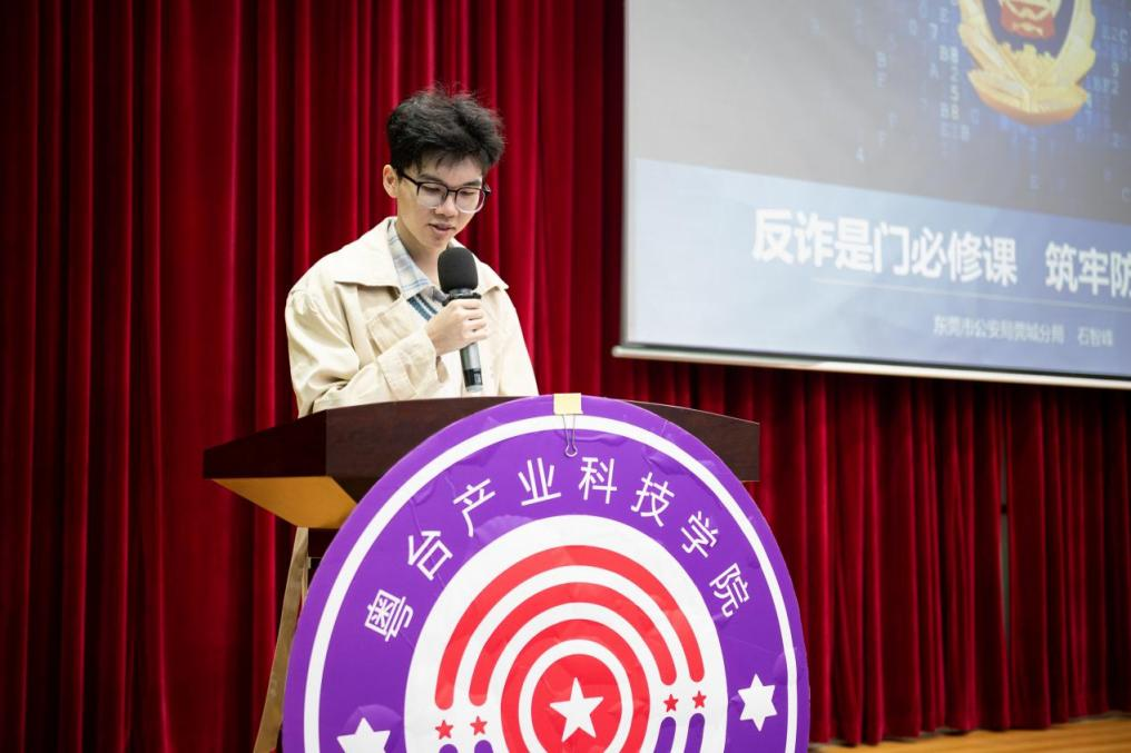 讲座特邀莞城公安局石智峰大队长担任主讲。石警官结合2024年莞城辖区发生的486宗真实案例数据,深入剖析了刷单返利、冒充客服、虚假购物等六大高发骗局。他以专业视角指出,现代电诈已形成完整的黑灰产业链,其核心危害在于通过“洗脑”使受害人主动配合。为此,他现场传授了“身份无法确认+远程沟通+要求转账=诈骗”这一简易识别公式,帮助师生快速识别骗局。