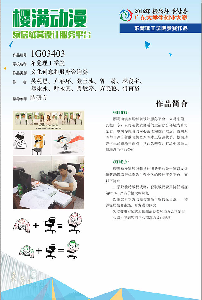 虽然樱满团队的成员都是大一学生,但他们在指导老师陈研方博士及学院全体老师的大力支持和用心指导下,齐心协力、众志成城,经过两个月的努力,一路过关斩将,最终得到大赛的肯定,获得金奖的荣誉。樱满团队的成员表示,今后将继续努力,争取再为happy漫画