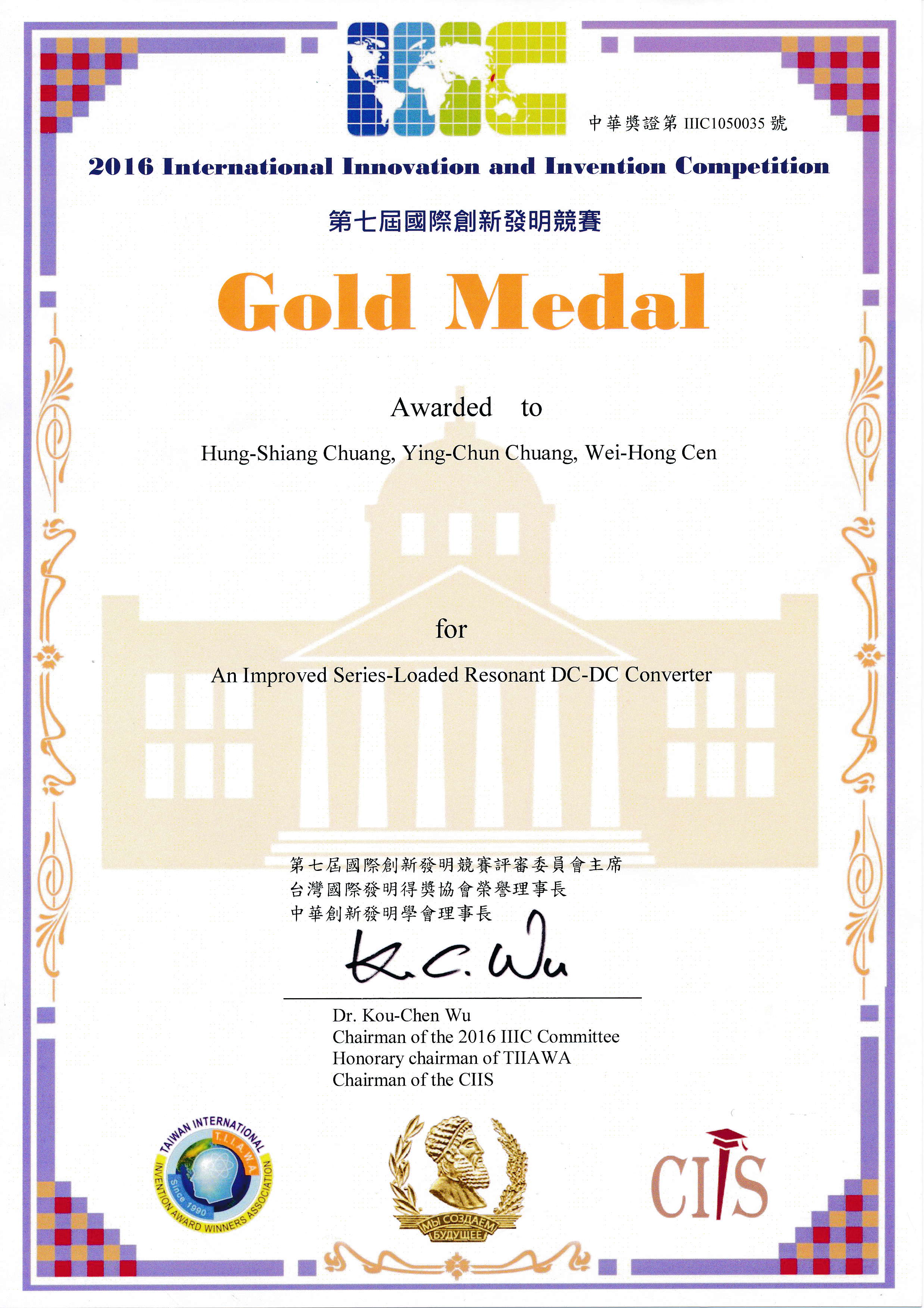 2015级机械设计制造及其制动化(精密制造)专业学生岑伟洪作为主要成员参与的专题研究项目《一种改良型的串联负载谐振DC-DC变流器》获得金奖。