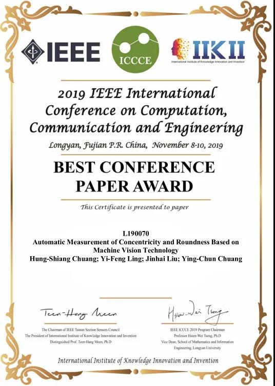 庄宏祥教授指导2016级机械专业学生凌奕锋撰写的论文“Automatic Measurement of Concentricity and Roundness Based on Machine Vision Technology”获最佳论文奖。