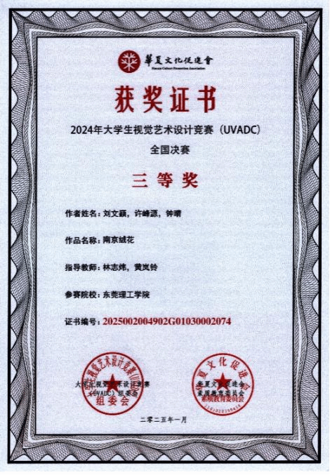 历来重视以赛促学工作,积极组织学生参加比赛,本次获得国赛三等奖的作品是《南京绒花》,由刘文颖、许峰源、钟晴三名同学共同完成。