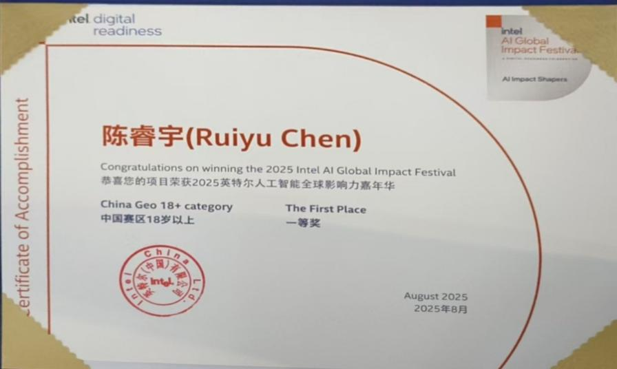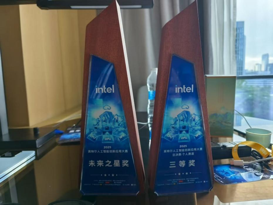 8月16日,2025英特尔人工智能创新应用大赛总决赛在深圳圆满落幕。本届大赛吸引了2817支参赛团队,提交作品1063份,大赛总热度达到5400万,是国内人工智能领域最具影响力的创新赛事之一。来自全国各地的参赛团队和个人选手围绕工业、教育、医疗、心理健康、游戏等领域展开巅峰对决。最终,经过激烈角逐,本院23级电商学生陈睿宇在众多比赛团队中脱颖而出,一举斩获”全球影响力嘉年华一等奖”、“个人赛道三等奖”和“未来之星奖”三项殊荣。
