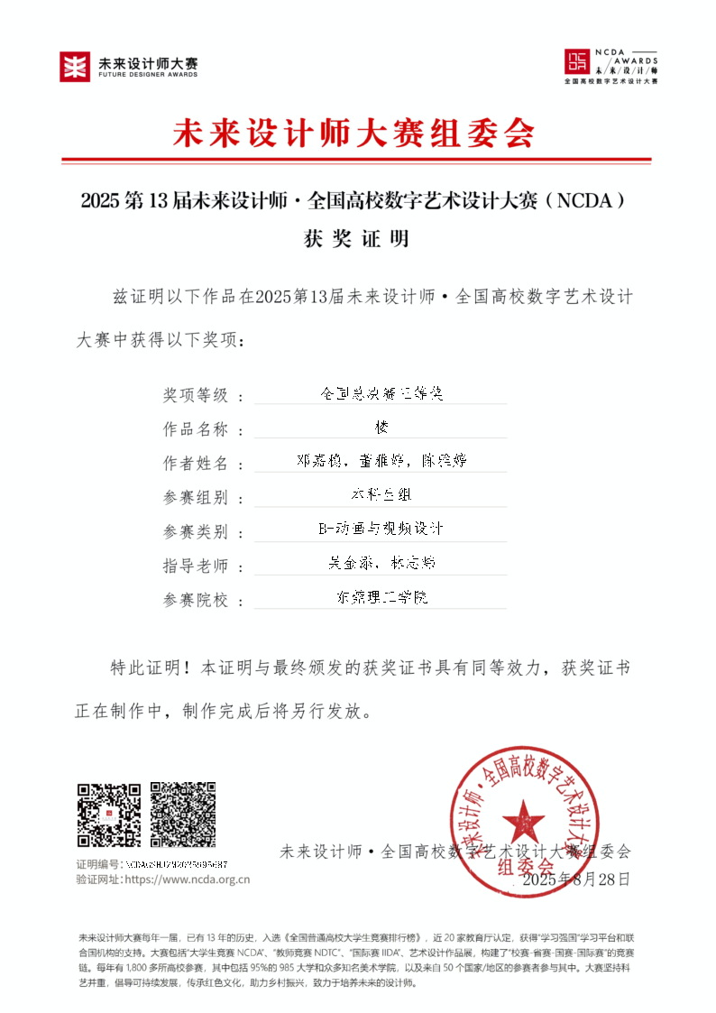 未来设计师·全国高校数字艺术设计大赛(NCDA)是入选《全国普通高校学科竞赛排行榜》,“学习强国”学习平台支持,对接联合国国际赛的国家级大学生竞赛。本届大赛共有1893所高校参赛,共征集29万余件作品,设立29个省级赛区,985、一流大学参赛率达95.2%,设计学学科评估C以上高校100%参赛。参赛作品经过校级赛、资格赛、省级初赛、省级决赛产生了各省赛区的一二三等奖,其中一二等奖晋级全国总决赛。